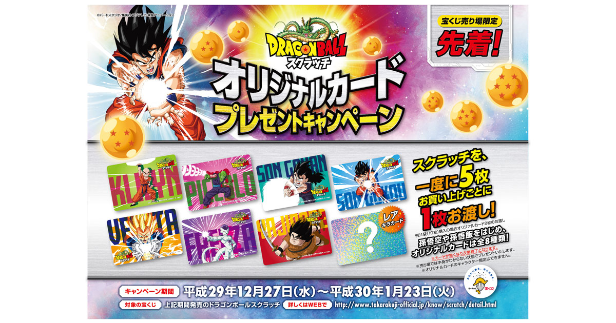 A cada compra de cinco bilhetes do “Dragon Ball Scratch” de uma só vez no balcão de venda de loteria, você receberá 1 “Cartão Original do Dragon Ball Scratch” de presente.