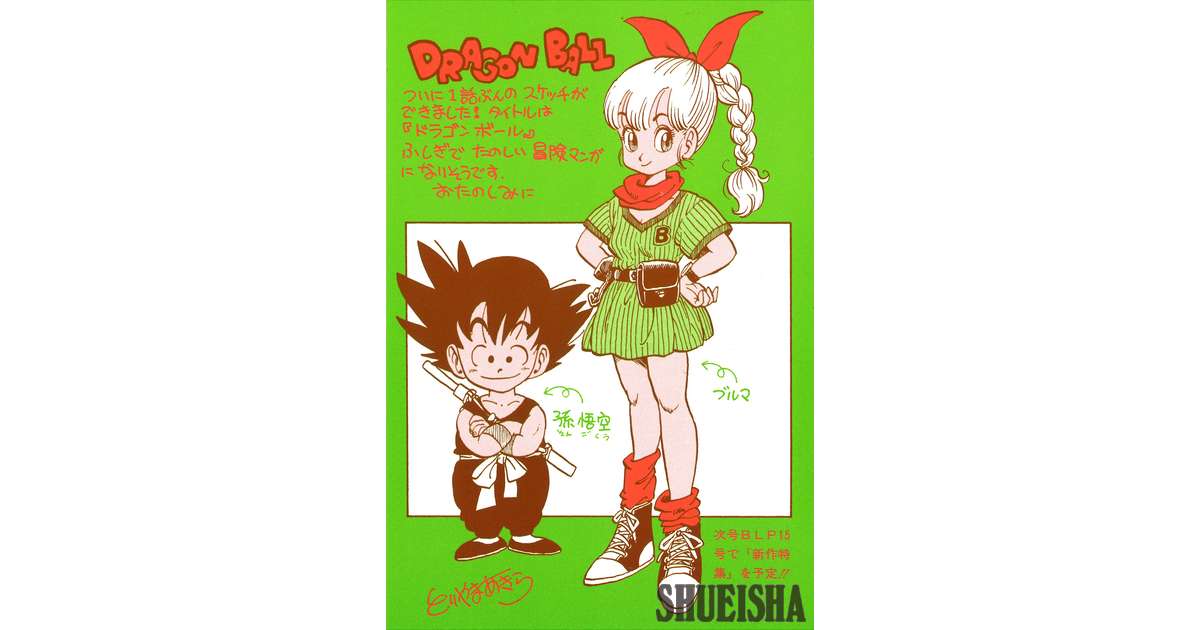 Cartão-postal enviado aos membros da Associação de Preservação Akira Toriyama. Junto da mensagem que anunciava pela primeira vez a decisão de iniciar a serialização de “DRAGON BALL”, está retratada uma ilustração inédita de Goku e Bulma, tornando esta uma peça de valor extremamente elevado.