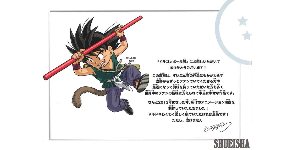 A exposição de originais Akira Toriyama – The World of DRAGON BALL foi realizada para celebrar o lançamento do filme DRAGON BALL Z: A Batalha dos Deuses. Para a ocasião, Akira Toriyama produziu uma ilustração inédita de Goku especialmente para o panfleto do evento e acrescentou uma mensagem bem-humorada aos visitantes: “Se assistirem com o coração batendo forte, animados e se divertindo, já está ótimo! Mas aviso desde já: não é para chorar.”