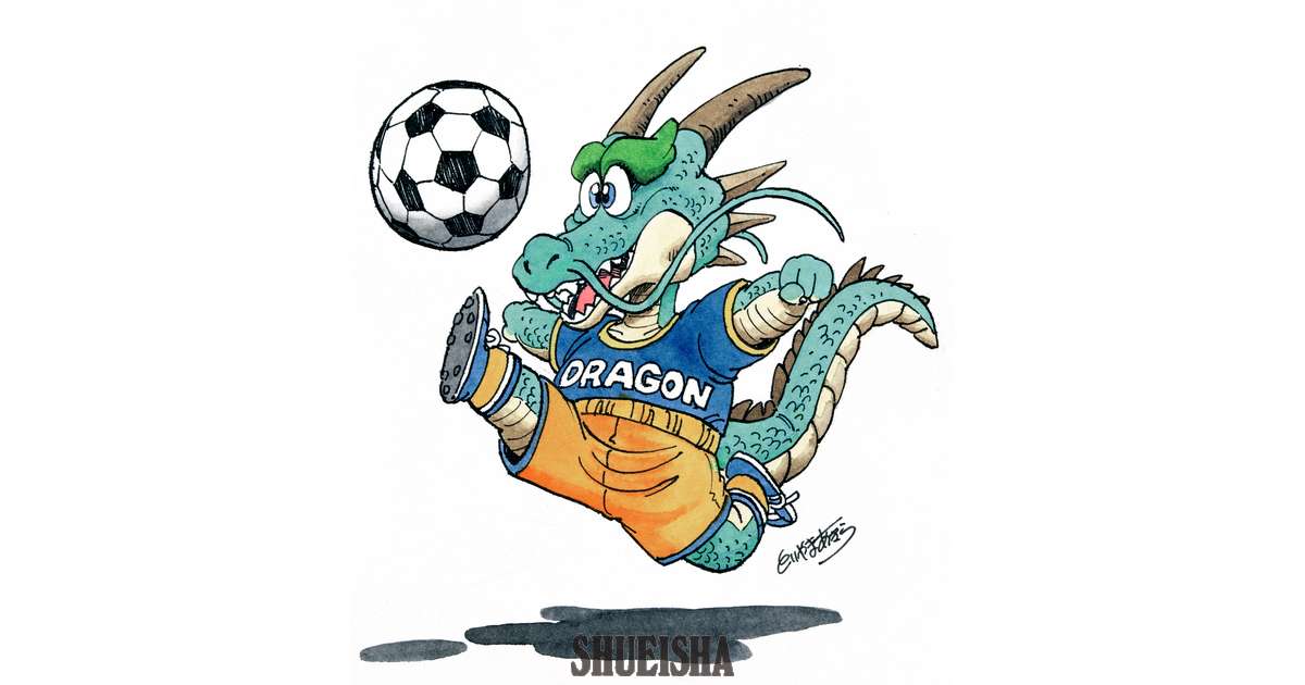 Design de um dragão jogando futebol. No ano em que foi desenhado, 1986, foi realizada a Copa do Mundo de Futebol no México.