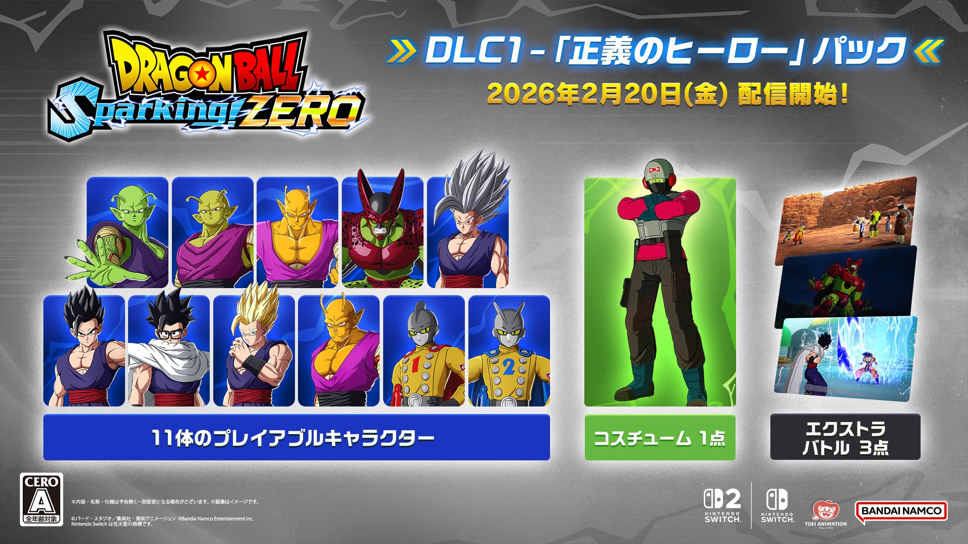 Paralelamente, a Bandai Namco confirmou o lançamento do DLC 1 – “Justice Hero Pack”, disponível a partir de 20/02, adicionando 11 personagens jogáveis do filme Dragon Ball Super: Super Hero, incluindo Son Gohan Beast e Cell Max.