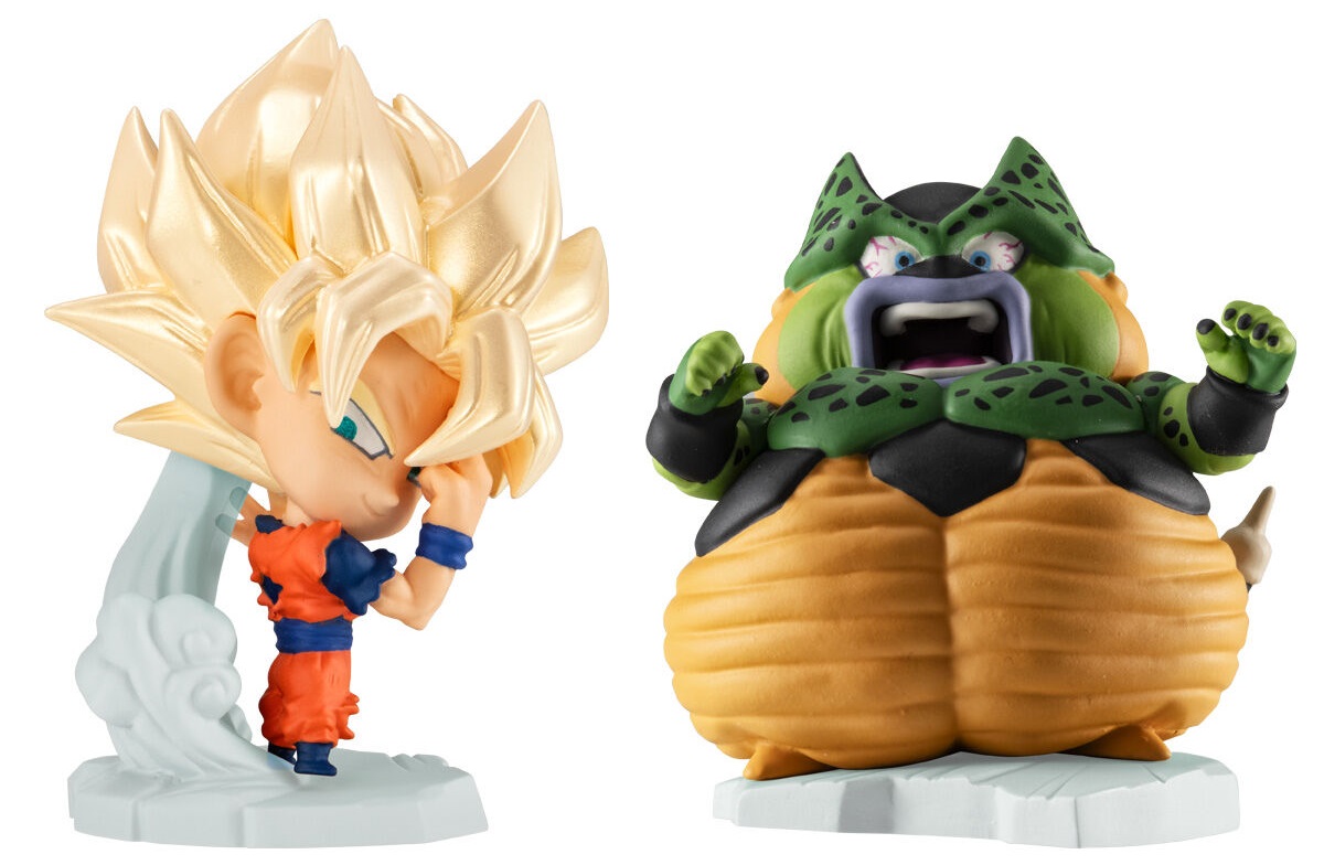 Cada unidade inclui uma figura pré-pintada (entre 9 tipos possíveis) e um chiclete sabor soda. As peças são produzidas em PVC e possuem cerca de 5 cm de altura e entre os personagens confirmados estão versões de Son Goku, Vegeta, Trunks e Cell, além de variações raras com acabamento especial.