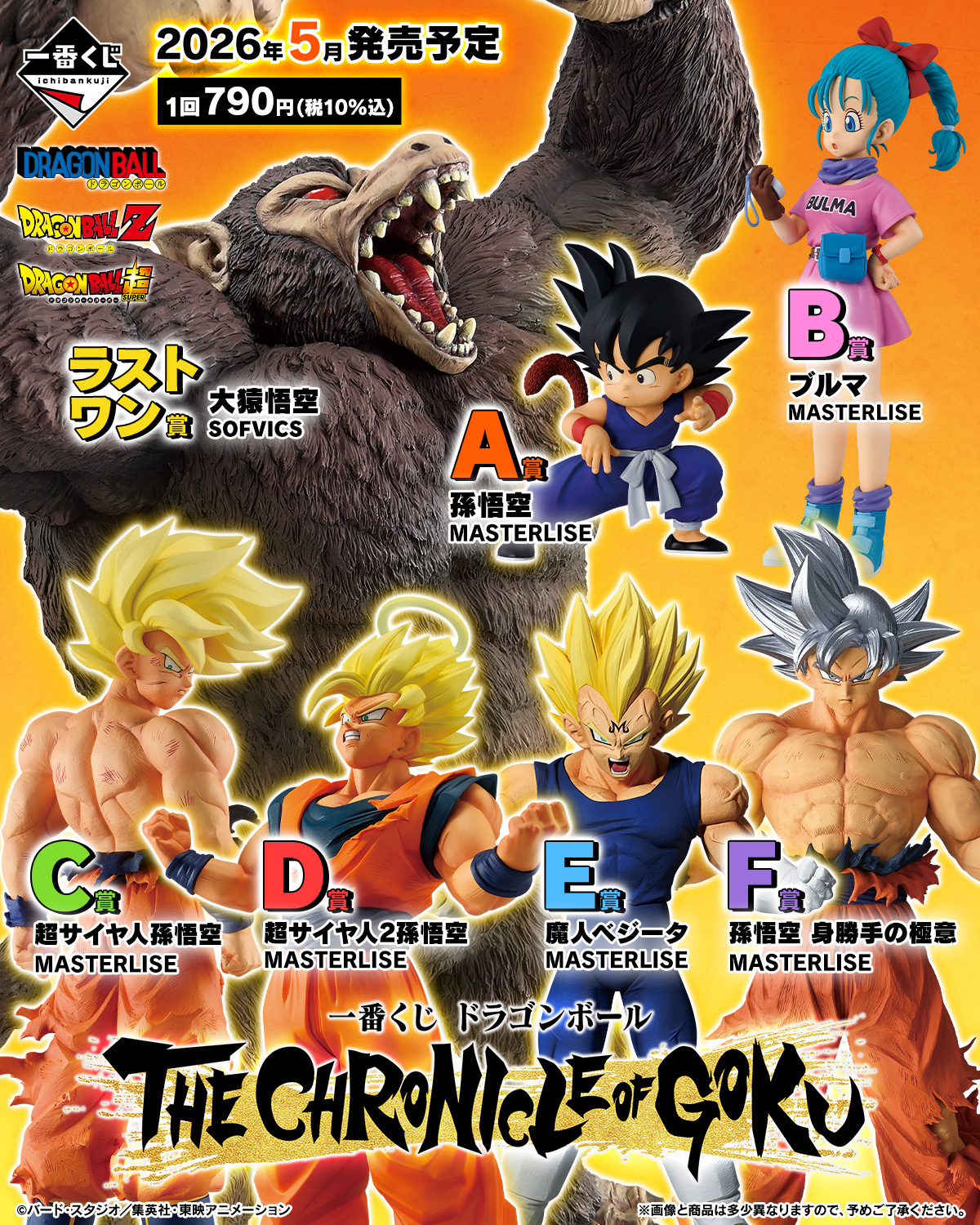 A BANDAI SPIRITS divulgou as primeiras imagens oficiais da loteria Ichiban Kuji Dragon Ball THE CHRONICLE OF GOKU, com lançamento previsto para o início de maio de 2026 no Japão. A nova linha reúne diferentes versões de Son Goku e outros personagens em modelos da linha MASTERLISE e SOFVICS.