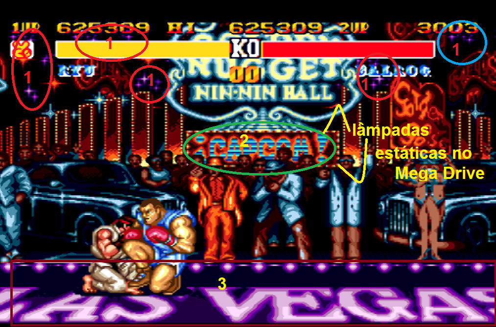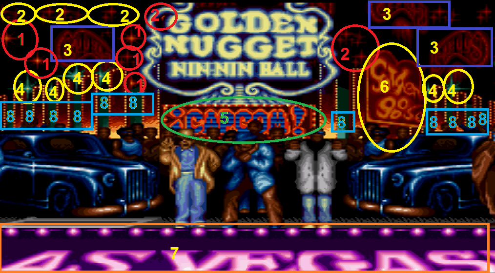 As lâmpadas que ficam no retângulo onde há o letreiro CAPCOM piscam em dois frames no SNES e estático no Mega Drive. Por fim, o assoalho onde está escrito LAS VEGAS possui 4 frames no SNES e no Mega Drive, porém a animação flui melhor no SNES.