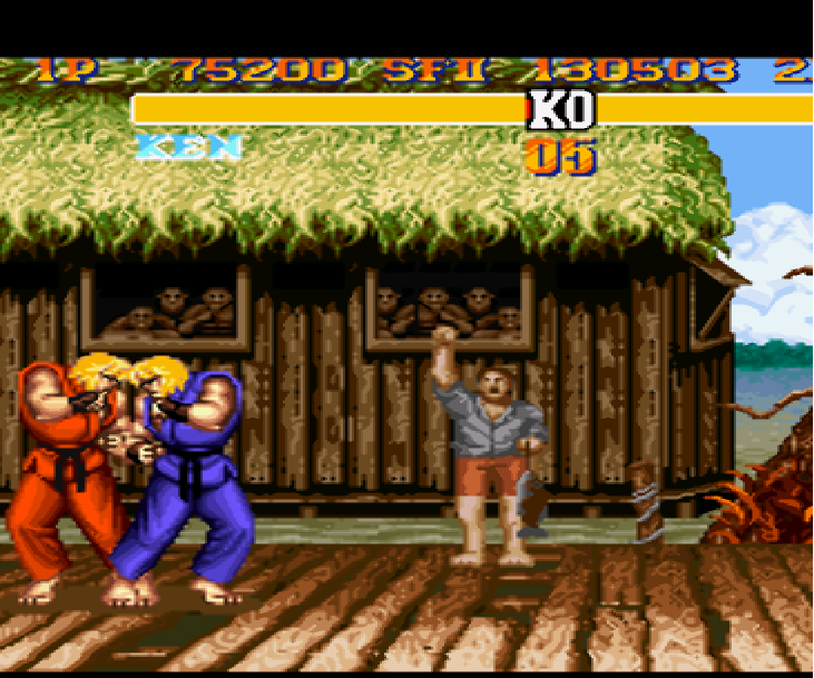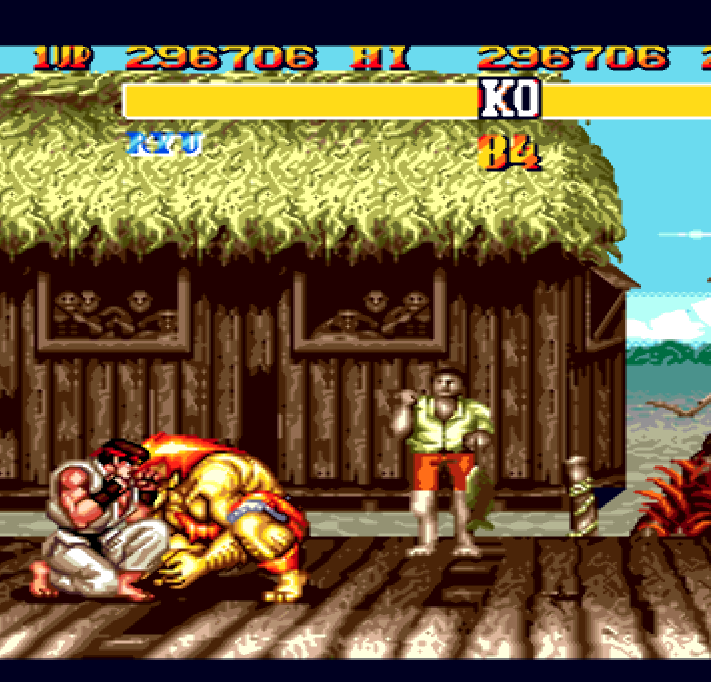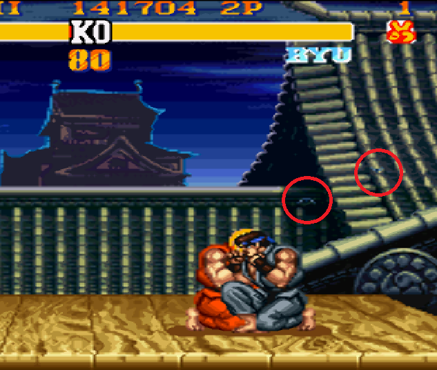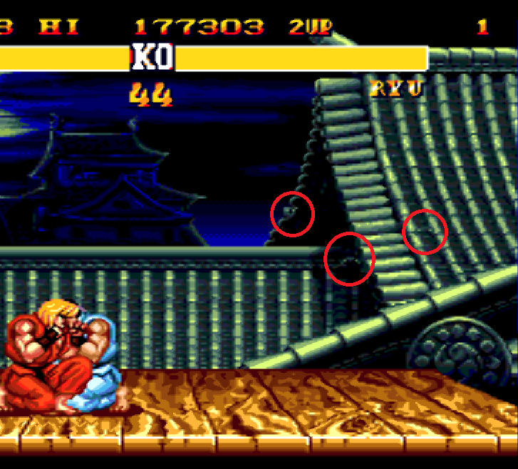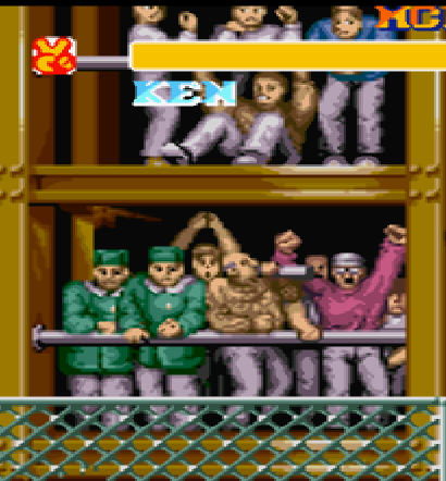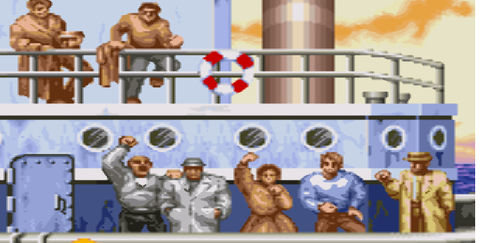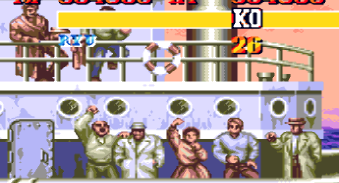 Tanto o Mega Drive quanto o SNES possui o mesmo quantitativo de personagens ao fundo, cada um com 2 frames. Há uma bandeira tremulando no corner direito do cenário, em um iate ao fundo. A bandeira possui 3 frames tanto no SNES quanto no Mega Drive. O barco onde todos os personagens que assistem a peleja estão possui uma animação de 3 frames, tanto no Mega Drive quanto no SNES, simulando o balançar de um barco no mar, assim como no fliperama.