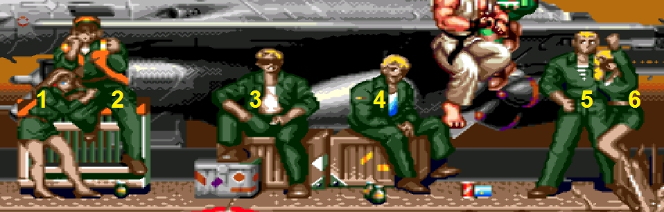 O Mega Drive possui a quantidade exata de militares assistindo ao fundo a peleja. São seis militares ao todo. O SNES possui apenas quatro. Para facilitar a comparação, nomeamos os personagens em letras e números: