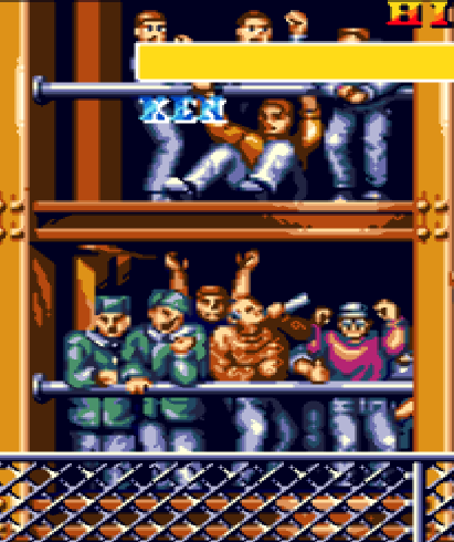 Na parte de baixo do cenário, os personagens 1, 2, 3, 4, 5, 6 e 7 possuem animação no SNES. Já no Mega Drive, o único que não possui animação é o personagem 7. Entretanto, o corpo do personagem 1 e o braço do personagem 5 são estáticos no SNES, o que não ocorre no Mega Drive, apesar de possuir a mesma quantidade de frames que no SNES.