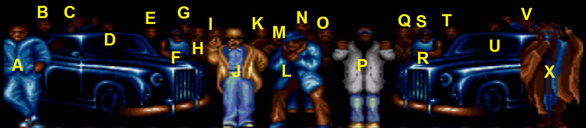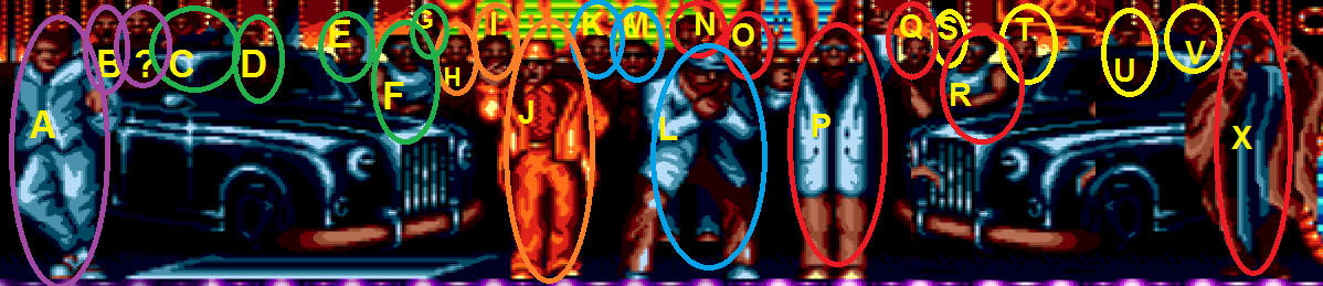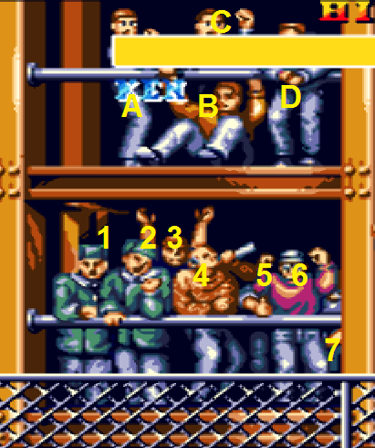 Essa parte do cenário do Zangief possui sete personagens na parte de baixo e quatro personagens na parte de cima e sete personagens na parte de baixo. Essa é a única área animada em todo o cenário do Zangief. Para facilitar a comparação, nomeamos os personagens em letras e números: