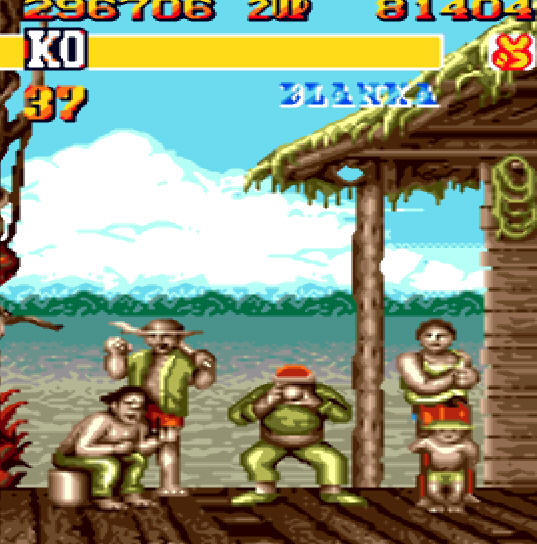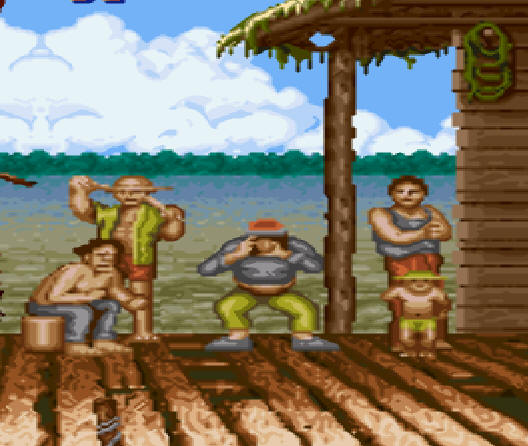 São sete personagens dentro da casa de palafitas neste cenário, tanto no Mega Drive quanto no SNES. A diferença está na posição em que eles se encontram. Nenhum deles possuem animações, ao contrário do Arcade onde alguns desses ribeirinhos vibravam. Já o rapaz com o peixe na mão possui dois frames nas duas versões, igualmente animados.