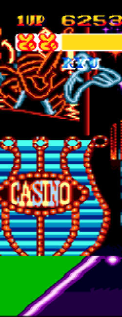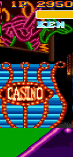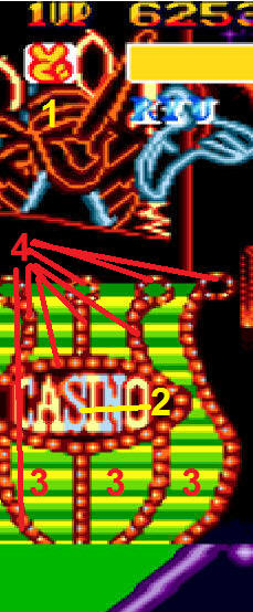 O corner esquerdo deste cenário possui luzes de neon animadas (1) com dois frames no SNES e estática no Mega Drive. O letreiro escrito CASINO (2) possui dois frames de animação e estático no Mega Drive. As lâmpadas redondas que formam uma "harpa" em torno do letreiro CASINO (3) também piscam em dois frames no SNES e também estáticos no Mega Drive. Por fim, as barras quadriculadas (4) formam um efeito cascata que mudam do tom azul para o tom verde após uma seqüência, mais rápida no Mega Drive, porém igualmente animados em ambos.