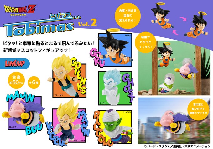 A linha Tobimas são figuras que se fixam com ventosas, criando o efeito visual de personagens “voando”. É possível prender em janelas, superfícies lisas ou até usar em carros e as peças possuem cerca de 50 mm de altura com suporte com ventosa, permitindo ajustes.